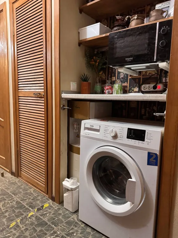 В общем холле стиральная машина, микроволновая печь, гладильная доска и утюг.